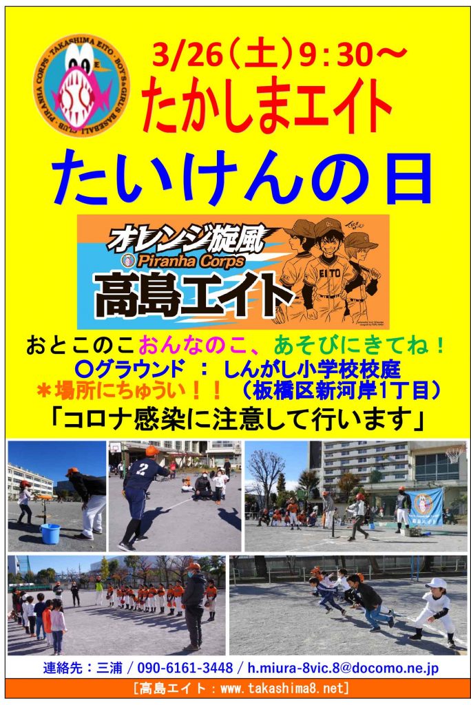 野球に興味を持ったキミたちに高島エイトを体験してもらうために「エイト体験の日」を開催いたします。お友達と一緒に遊びに来てください! 未就学児~4年生、待ってます!