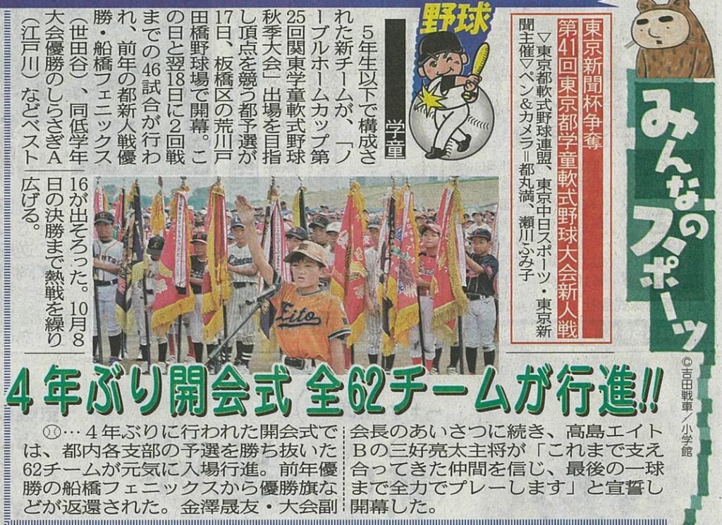 2023年9月22日(金) 9/22(金)東京中日スポーツ記事(東京都学童新人戦開会式) 9/22(金)に発行された東京中日スポーツに、東京都学童軟式野球大会新人戦開会式の記事が掲載されました。開会式では高島エイト主将が開催地第一代表として選手宣誓をおこないました。