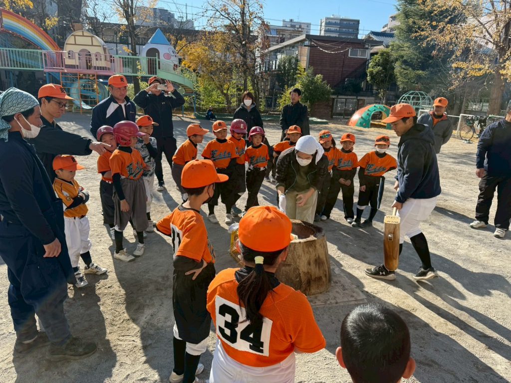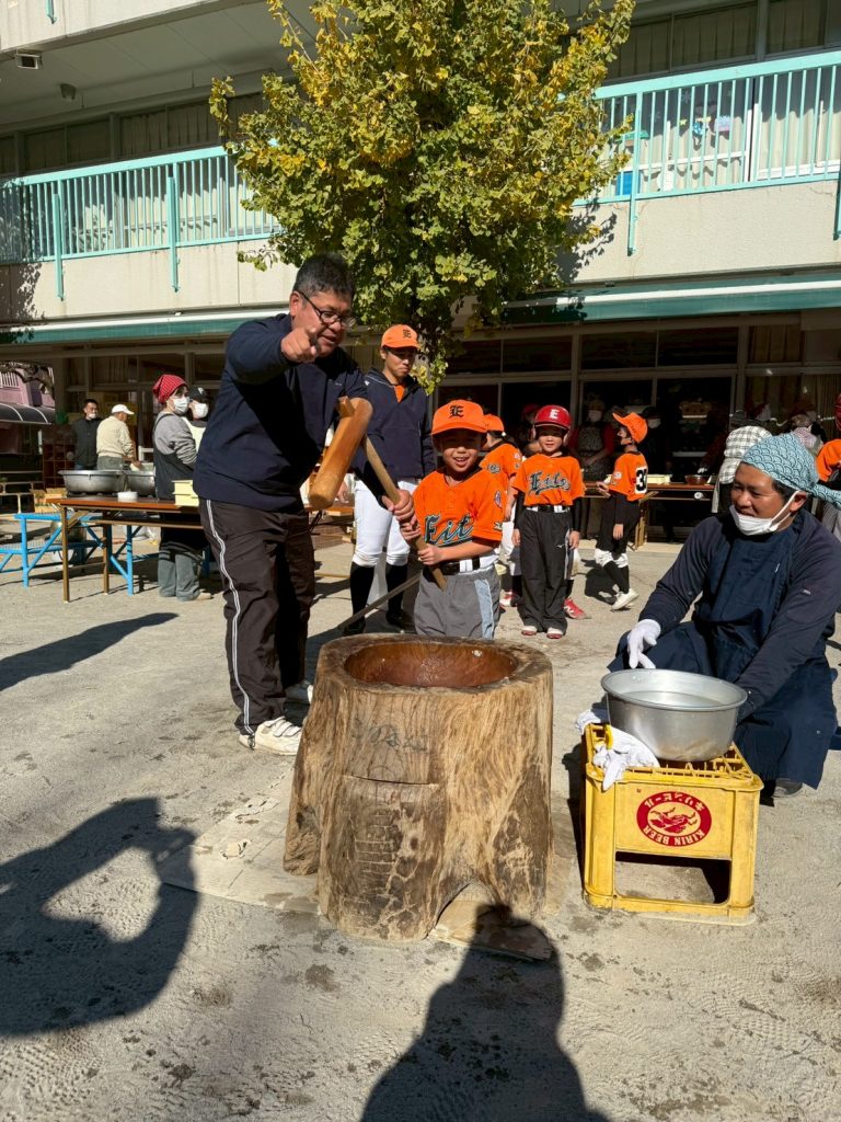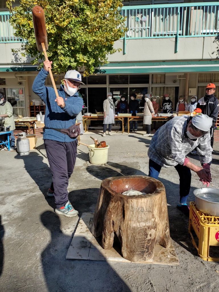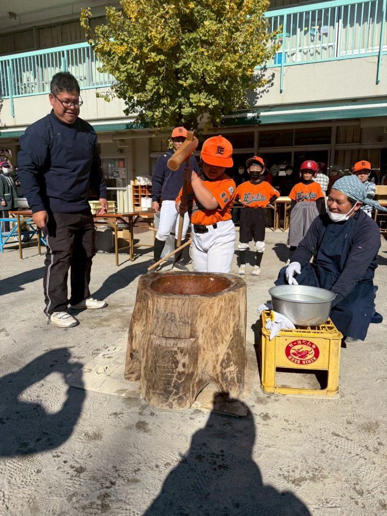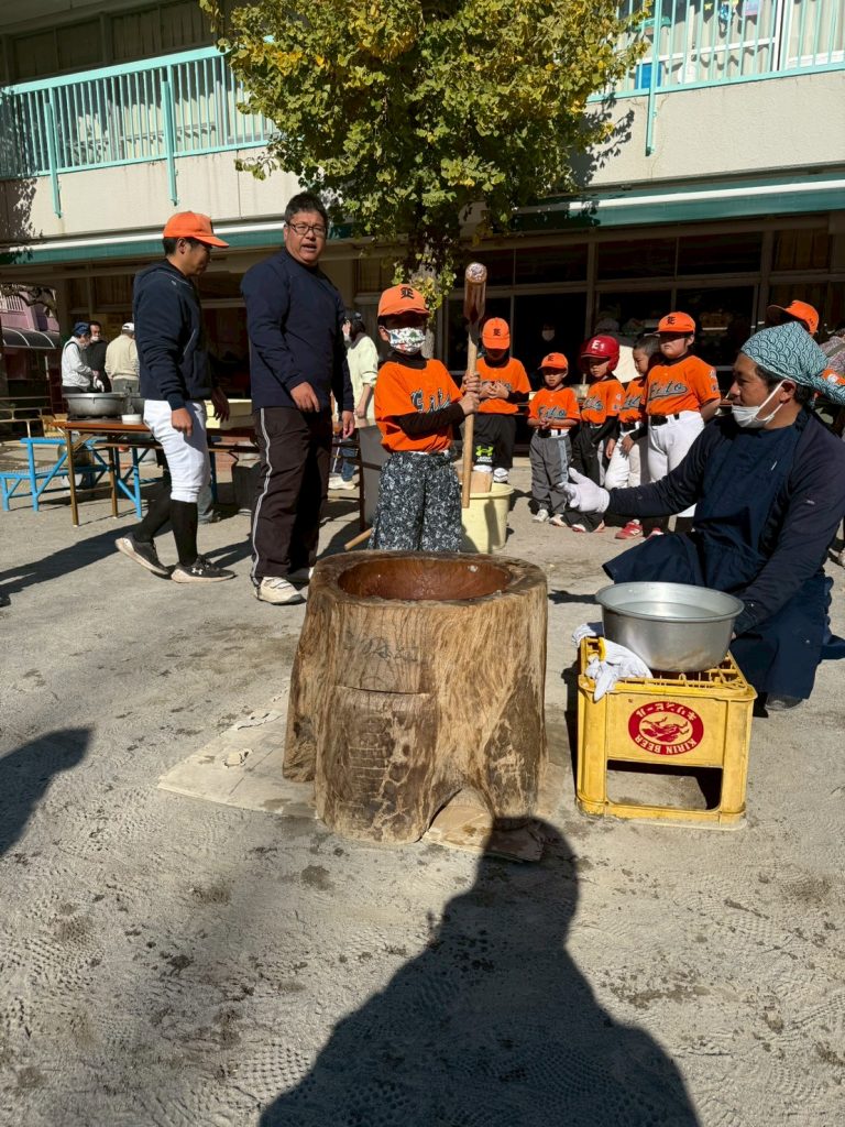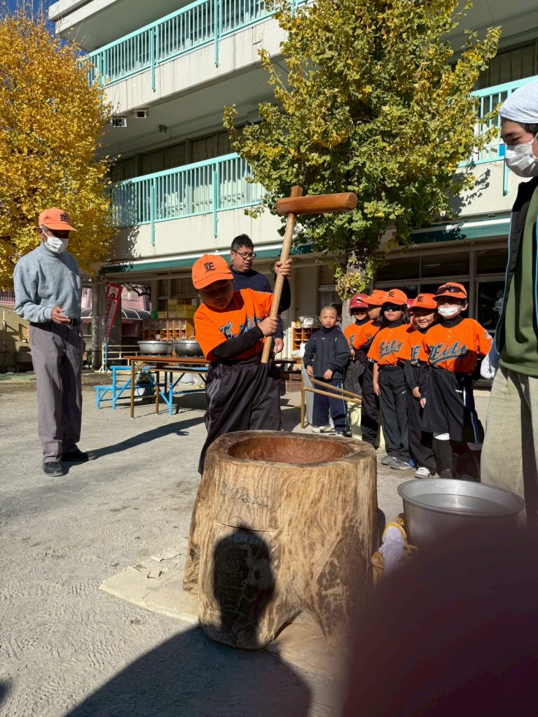 2025年12月16日(火) 12/7(日)町会もちつき大会 8ちょうめちょうかいの おもちつきに いきました。とんじると おもちを ごちそうになりました。ひとりずつ きねを かついで おもちを つきました。